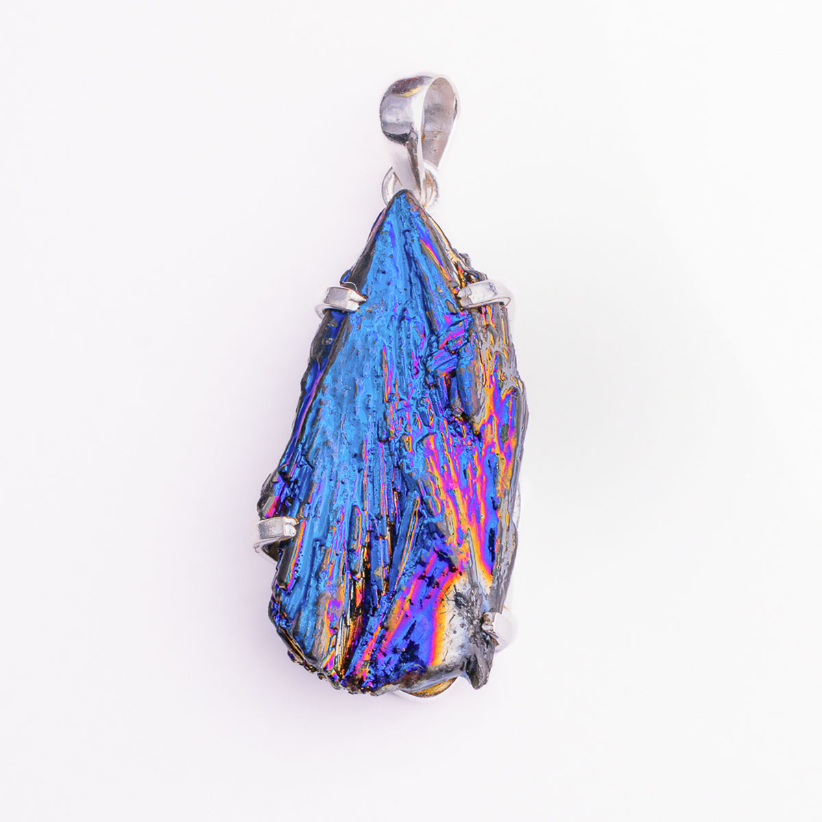 Silver pendant with titanium-coated black kyanite, in beautiful iridescent colors resembling a peacock’s tail