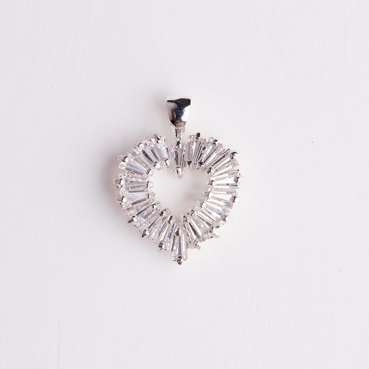 Silver pendant in the shape of a hollow heart, made of tiny white zircons