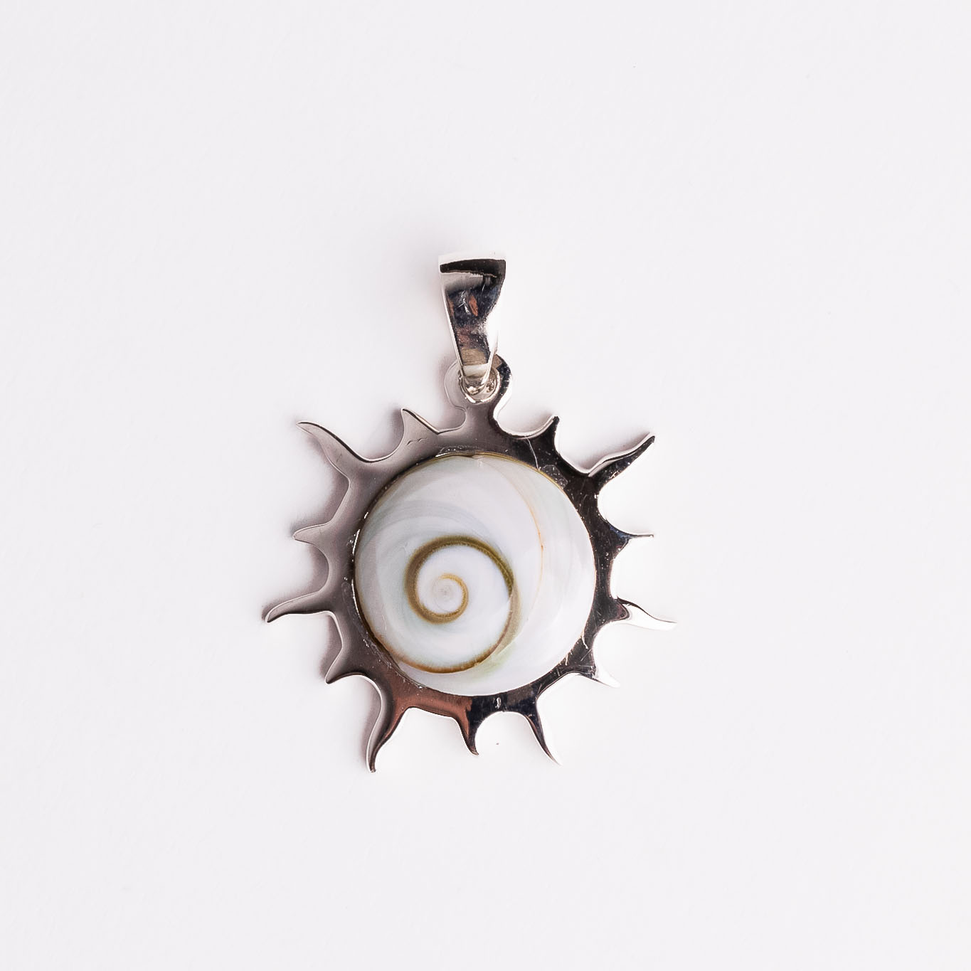 Silver pendant round with sun, made of Shiva eye shell