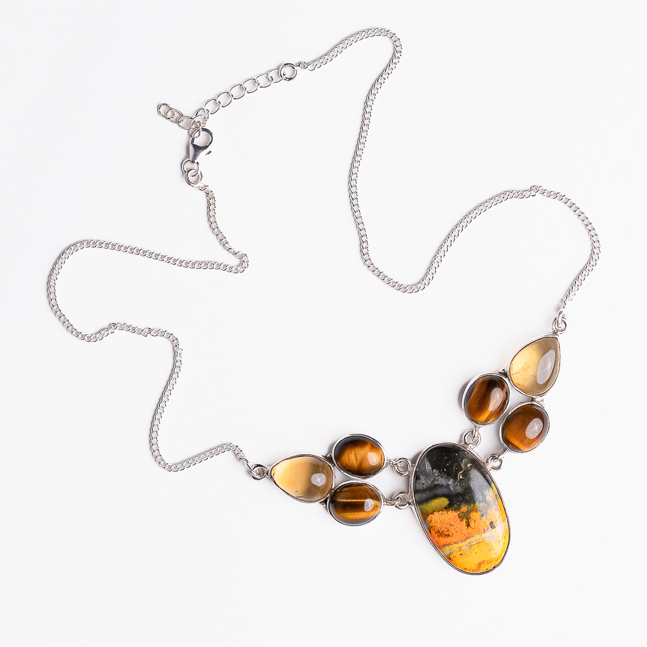 Srebrna ogrlica s ovalom bumblebee jaspera , 4 ovala tigrova oka i dvije suze citrina s lančićem