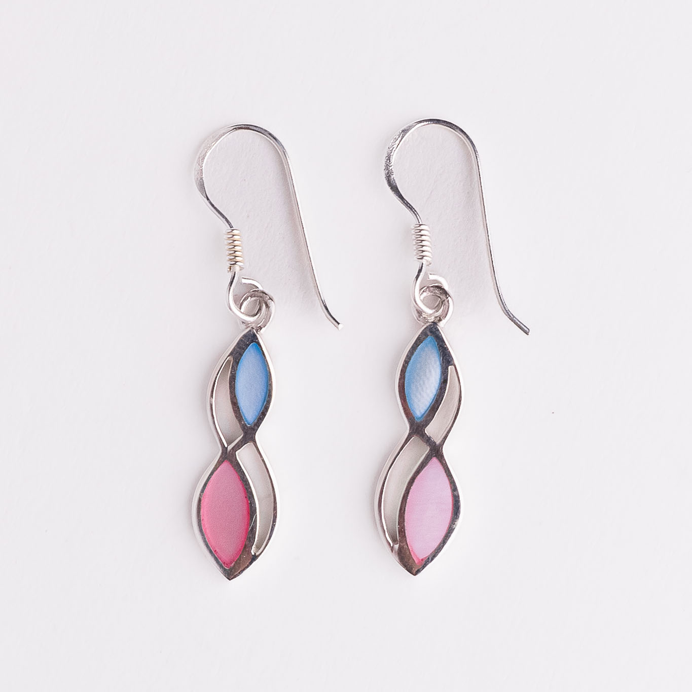 Viseće srebrne naušnice od dva špicasta ovala s raznobojnim sedefom